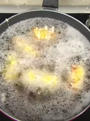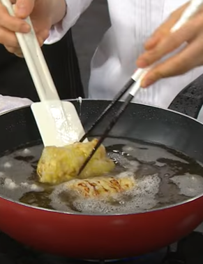 튀김옷 묻혀 예열된 기름에 튀겨내기