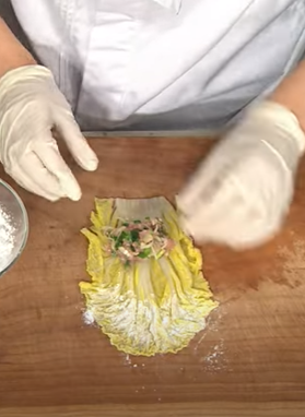 고기소 넣고 잎 부분에 전분(약간) 묻혀 돌돌 감싸기
